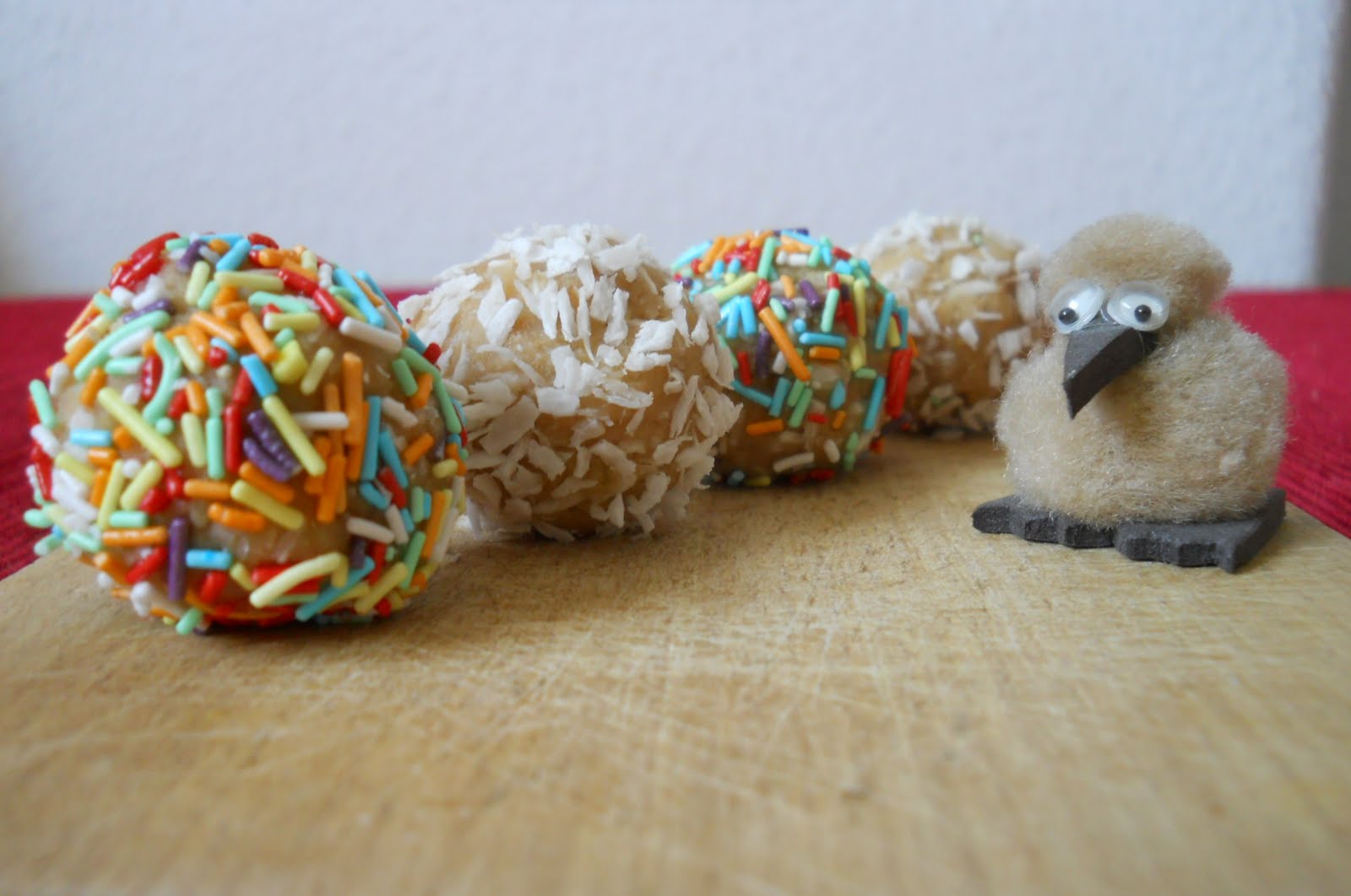 A banánokat összenyomjuk villával, a többi hozzávalót hozzáadjuk és gombócokat formázunk belőle, ezeket kókuszreszelékbe vagy tortadarába forgatjuk.
