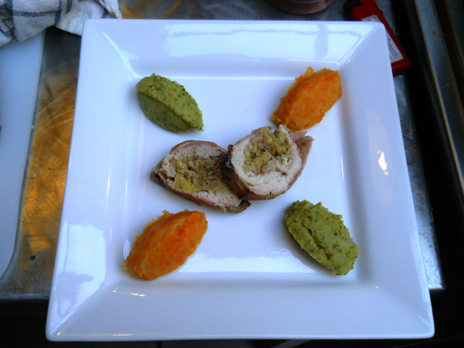 Gesztenyével-baconnal töltött pulykamell zöldséges krumplipürével és vörösáfonyamártással (sajnos a képről lemaradt a mártás)